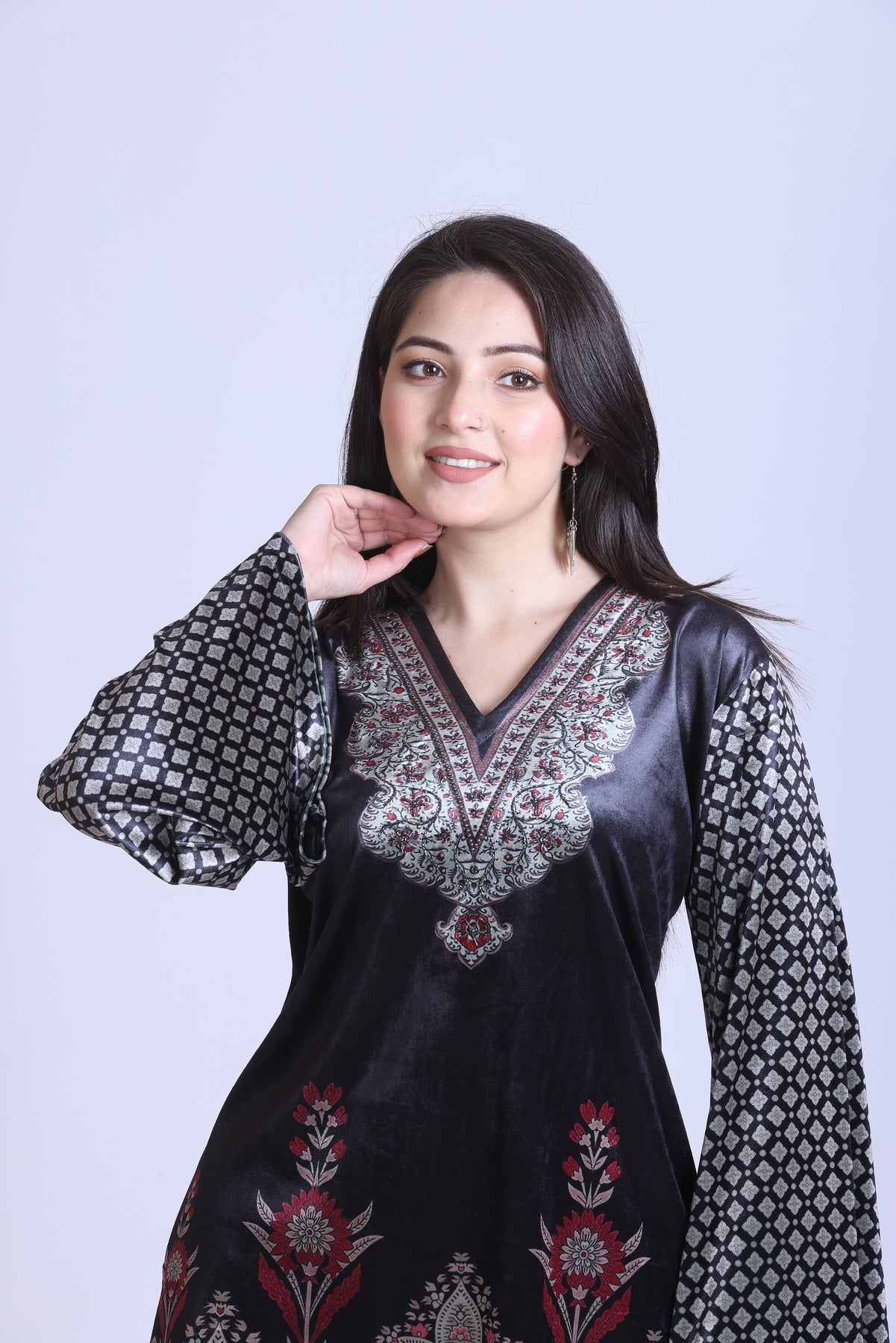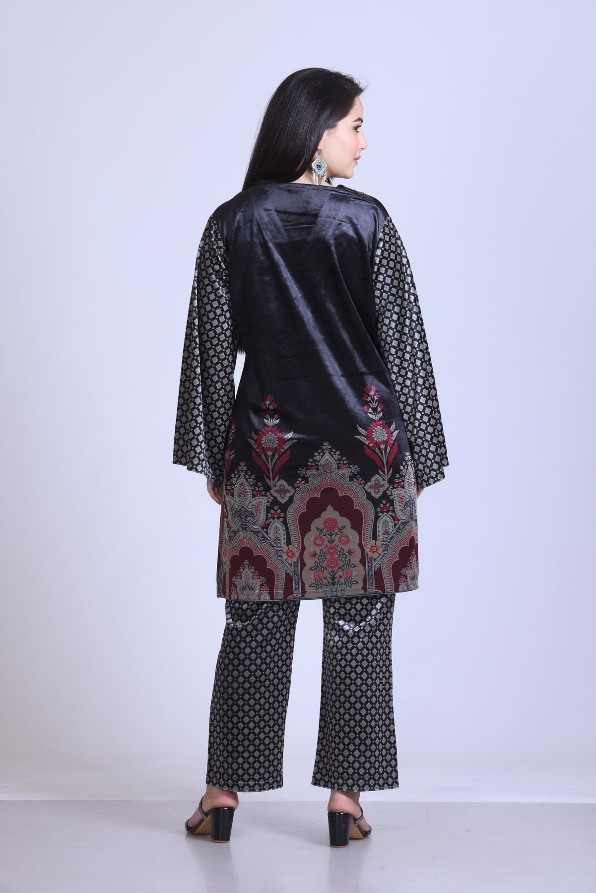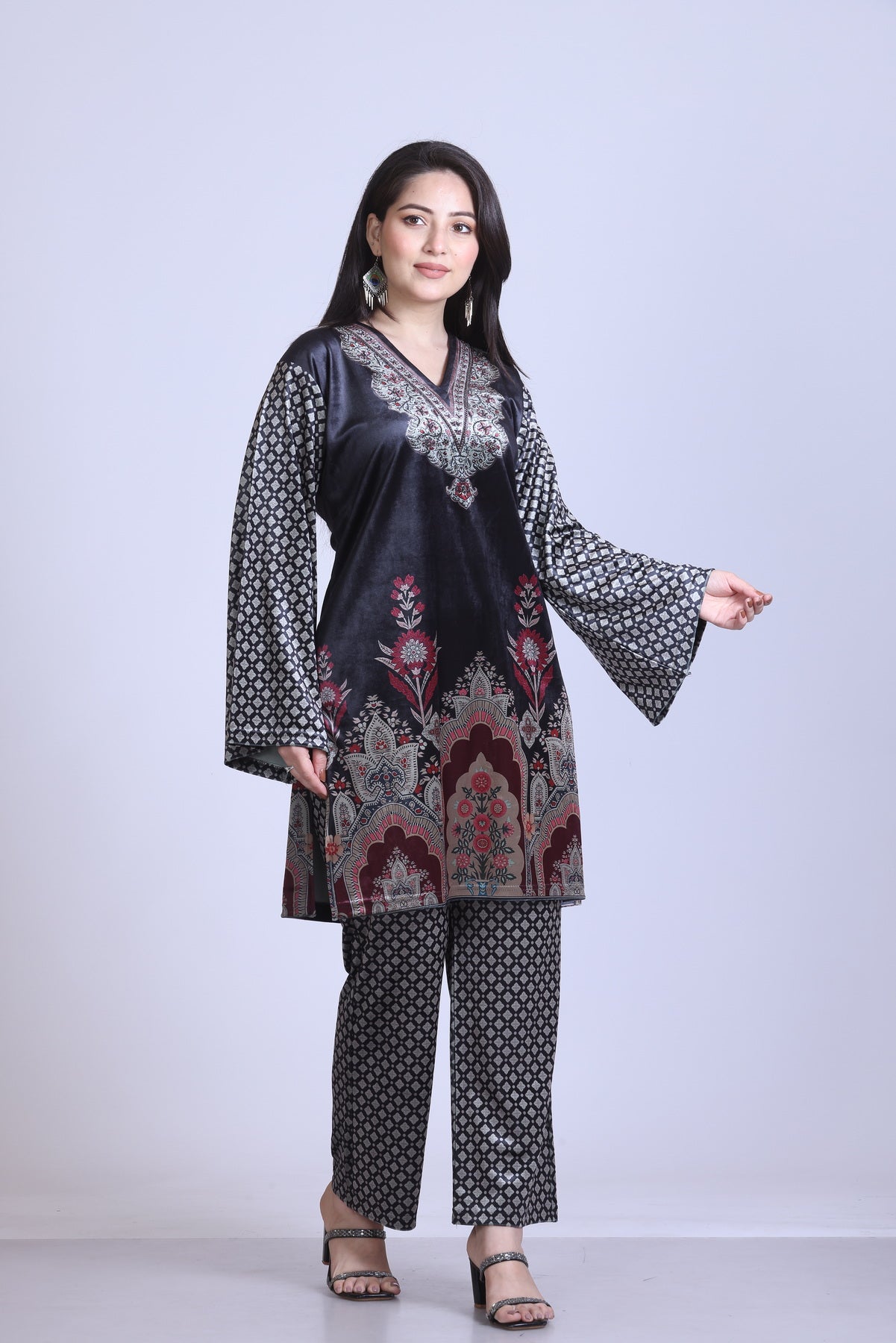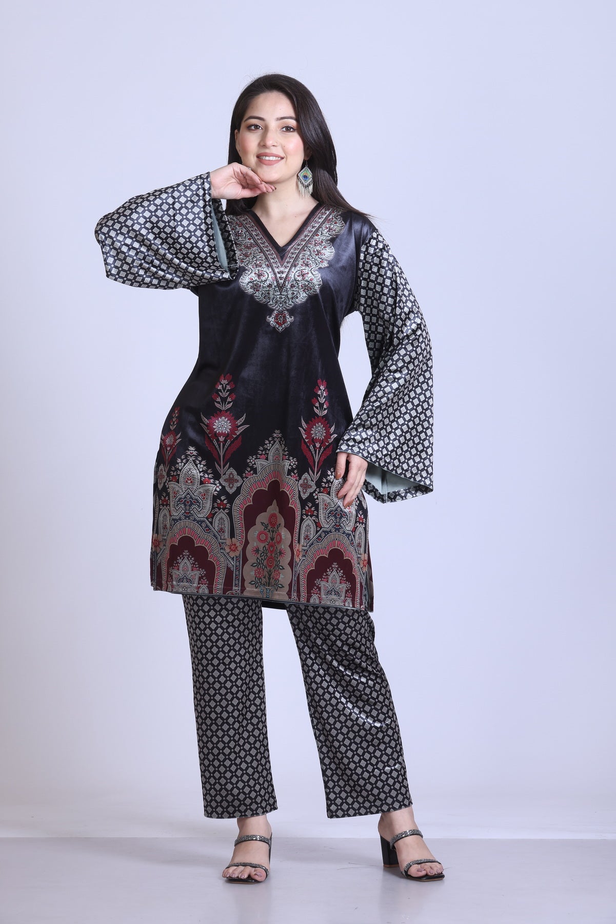 This stylish co-ord set showcases a v-neck and cascading sleeves,...