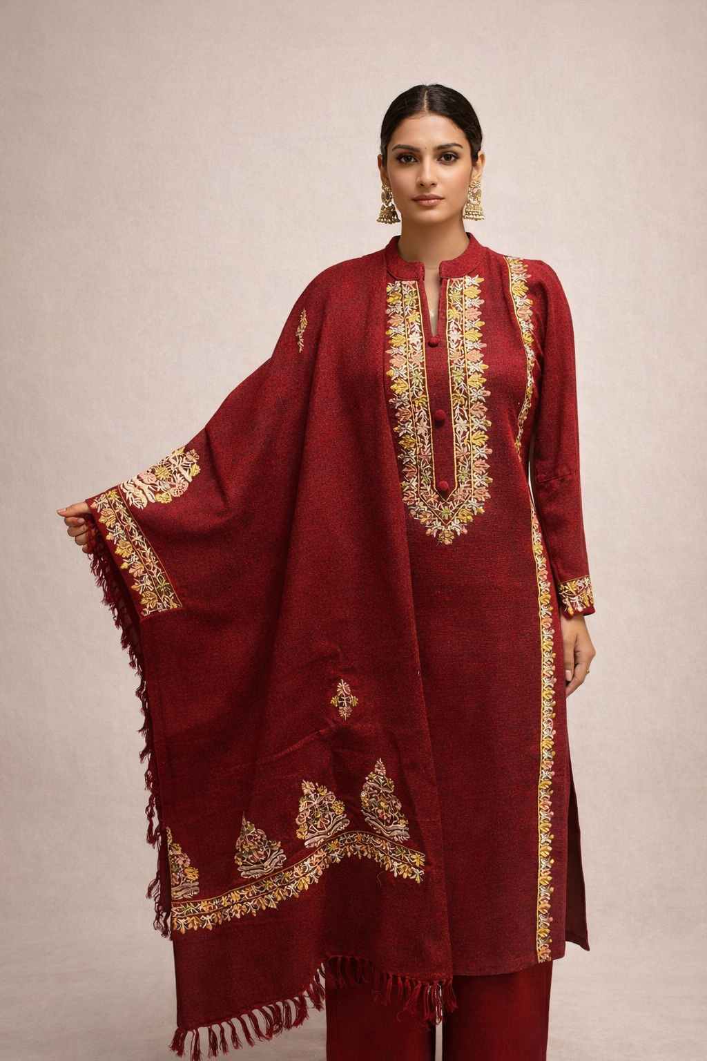 A three-piece kurta set featuring an embroidered shawl, designed for winter elegance. The ensemble combines comfort with refined style, perfect for seasonal celebrations and gatherings. Lightweight construction with delicate embroidery detailing adds sophistication without excess bulk.
