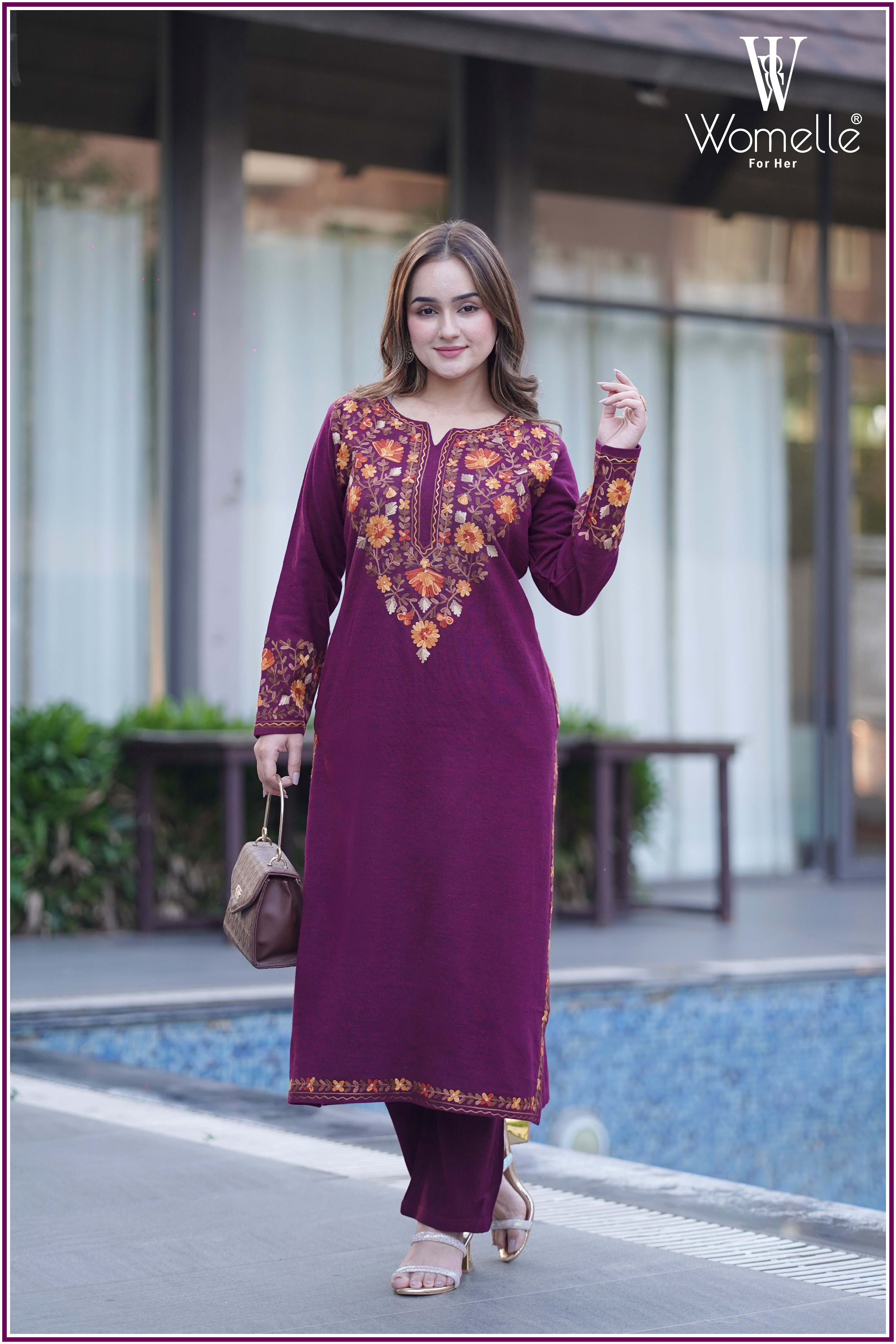 Made from a soft winter-friendly fabric, this set ensures comfort while keeping you warm, making it ideal for winter gatherings, festive occasions, family outings, or everyday sophisticated styling. The vibrant embroidery adds charm and richness, giving the outfit a premium, heritage-inspired appeal.