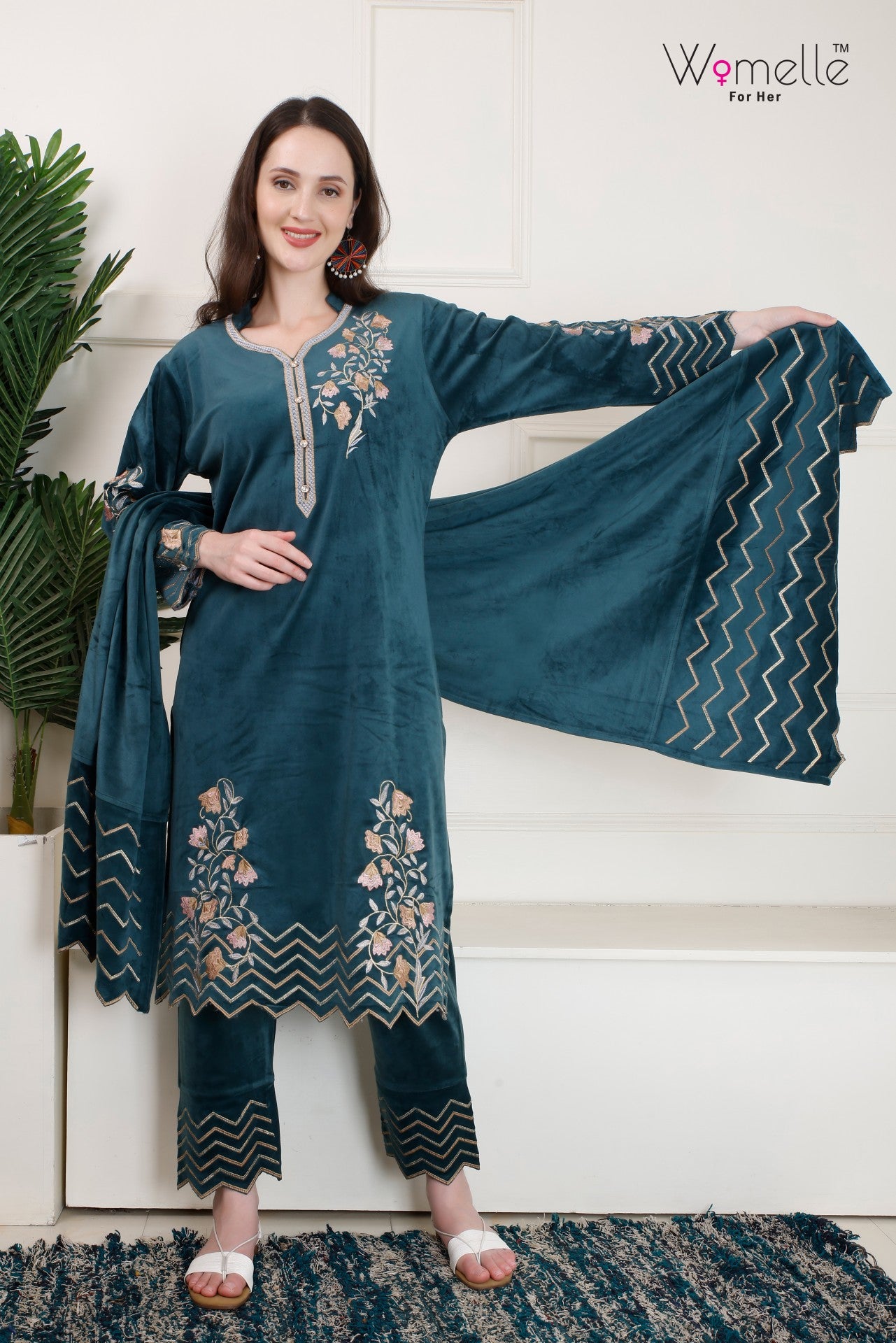 Elegant velvet kurta set featuring intricate floral embroidery and matching trousers with a coordinating dupatta, perfect for festive and semi-formal occasions.